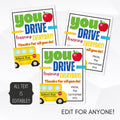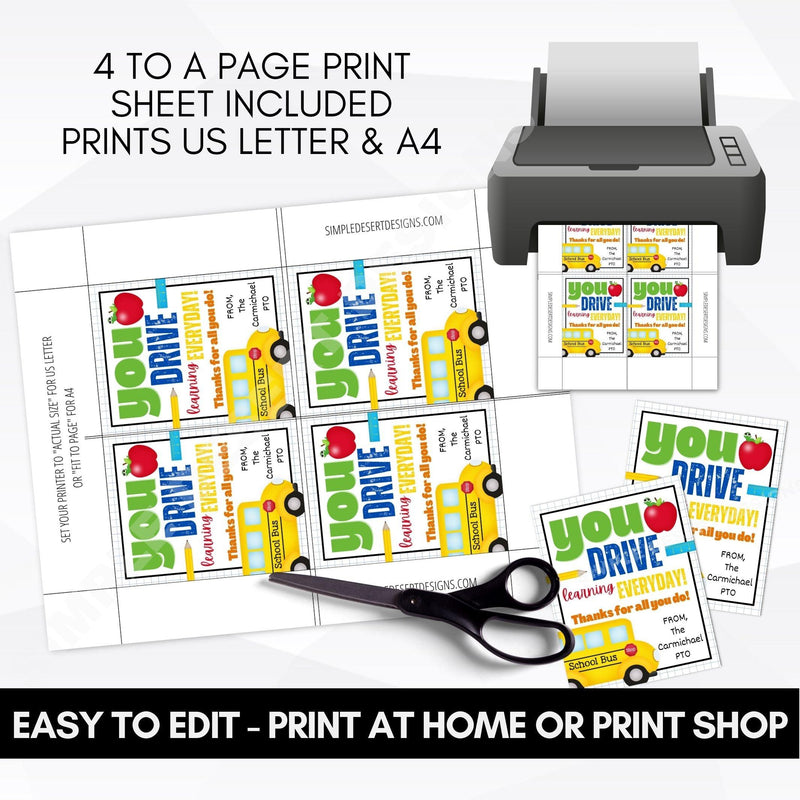 This "You drive learning everyday" editable school bus driver appreciation gift tag is perfect for student to bus driver gift tags, administration gifts for transportation department or district wide gift ideas. Use for end of school or last day of school appreciation week gifts. Give as school PTO or PTA teacher appreciation week tags or favor tags for your transportation appreciation week party.