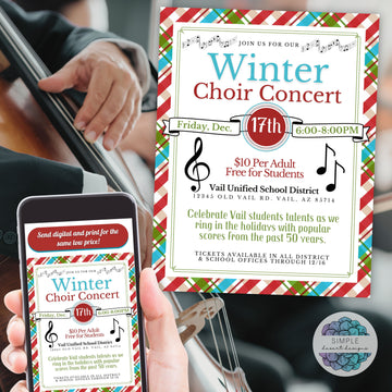 This Winter Concert Invitation Flyers Set will make your holiday event a hit! These eye-catching design templates feature fun graphics to get your community and neighborhood excited about your school band, choir or piano recital. Easily editable text allows you to switch from a Winter Choir Concert to a Winter Daddy Daughter Dance and more! So grab your jingle bells, and get ready for a winter night of music and merriment!
