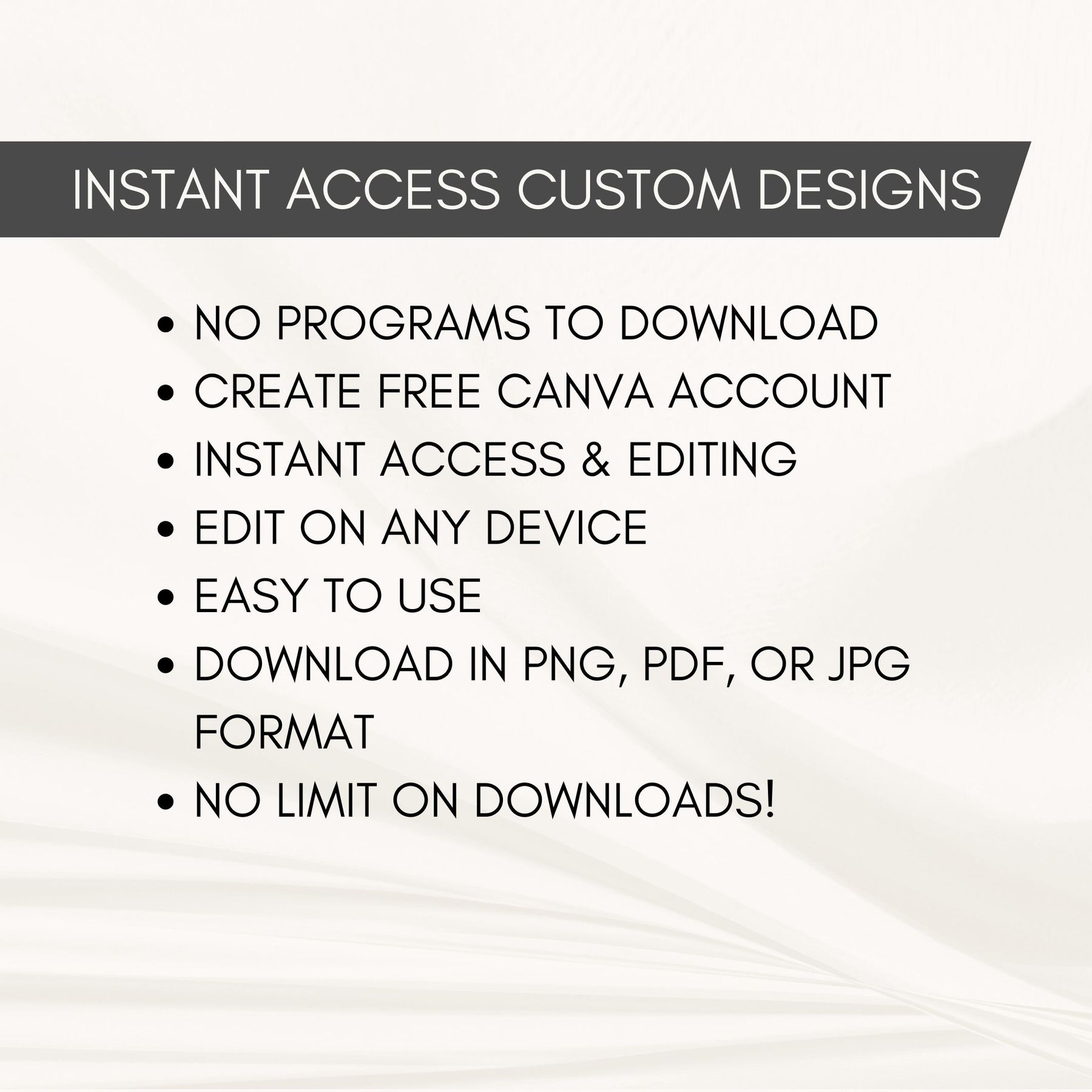 You are purchasing access to the template sold here which will be edited in Canva, a FREE online editing program that will allow you to edit this template to be just what you want. Edit on your phone, tablet or computer. Download and print from your home computer or at another print shop.