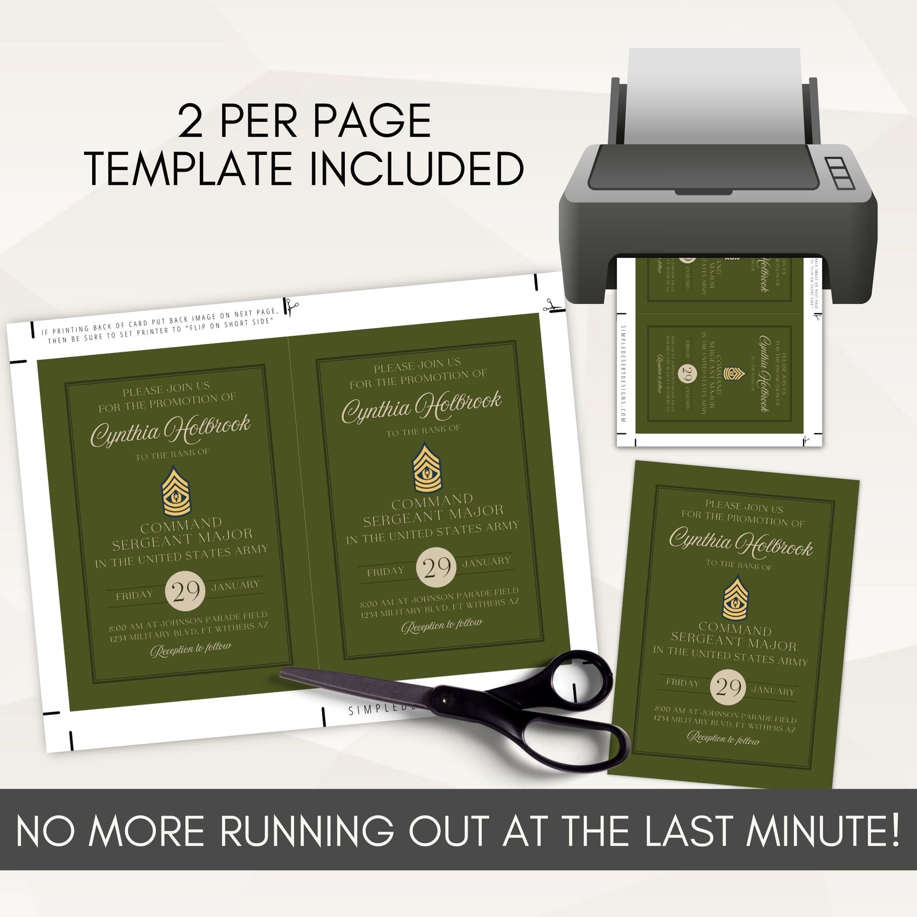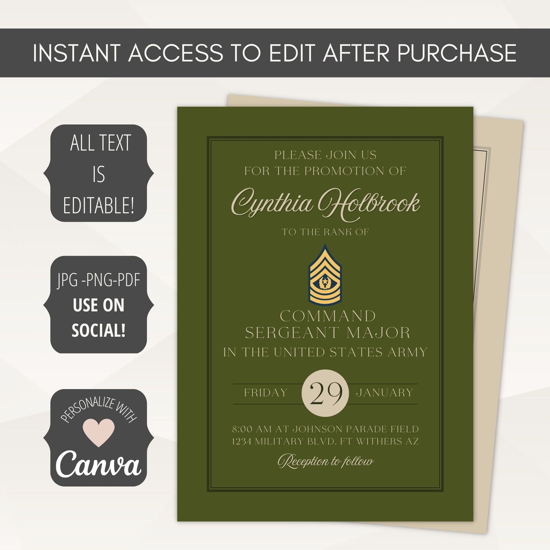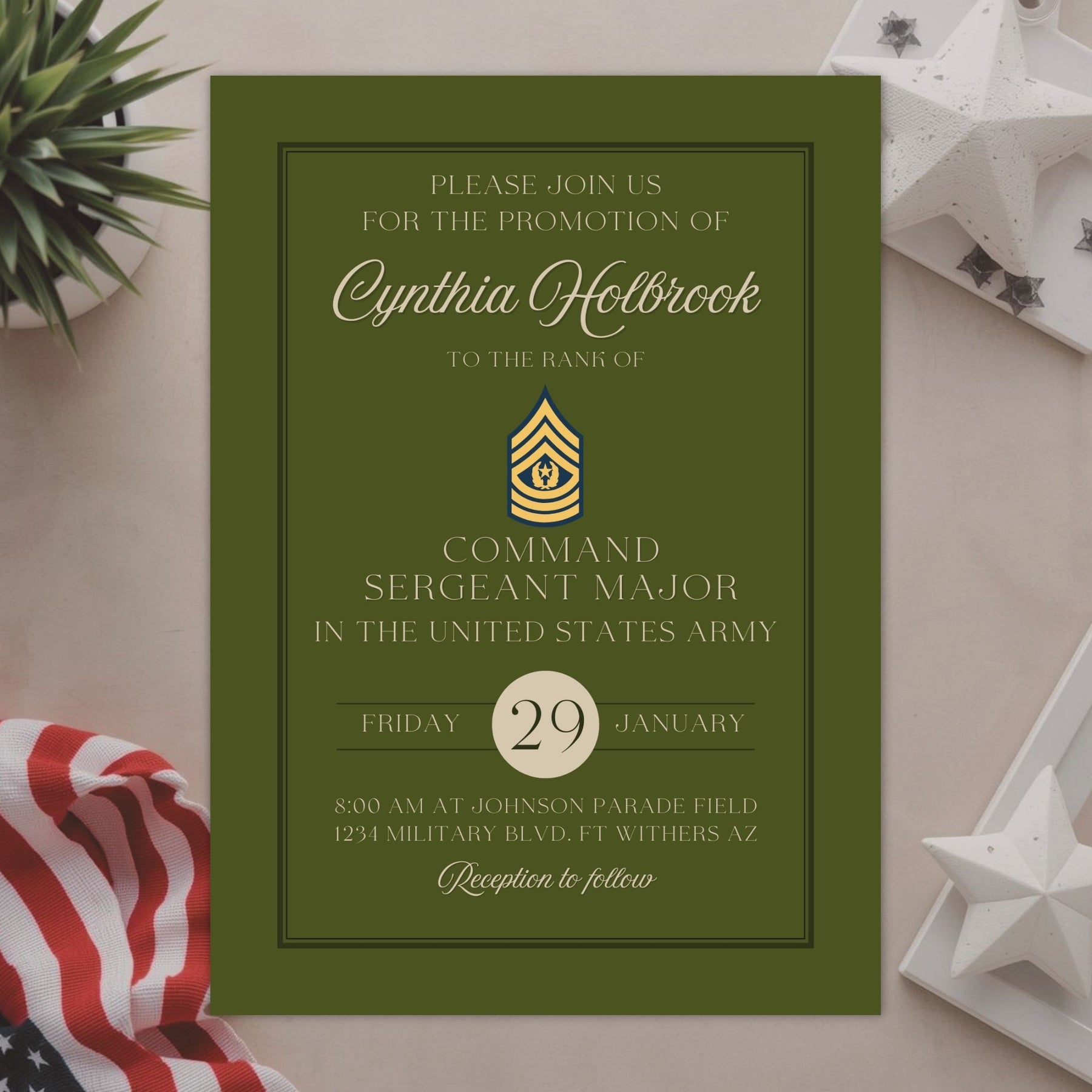 Honor your service member's achievement with this distinguished US Army Promotion Ceremony Invitation template. Featuring authentic Army green and khaki tones paired with elegant script typography, this design captures the formality and prestige of military advancement. Fully editable colors and elements accommodate all ranks—enlisted, warrant officer, and officer—making customization effortless. Choose between two professional layouts, then send digitally or print instantly with included trim lines. The vintage-inspired aesthetic brings sophistication to promotion parties, formal ceremonies, and military celebrations. Create a memorable invitation that reflects the significance of this milestone in minutes.