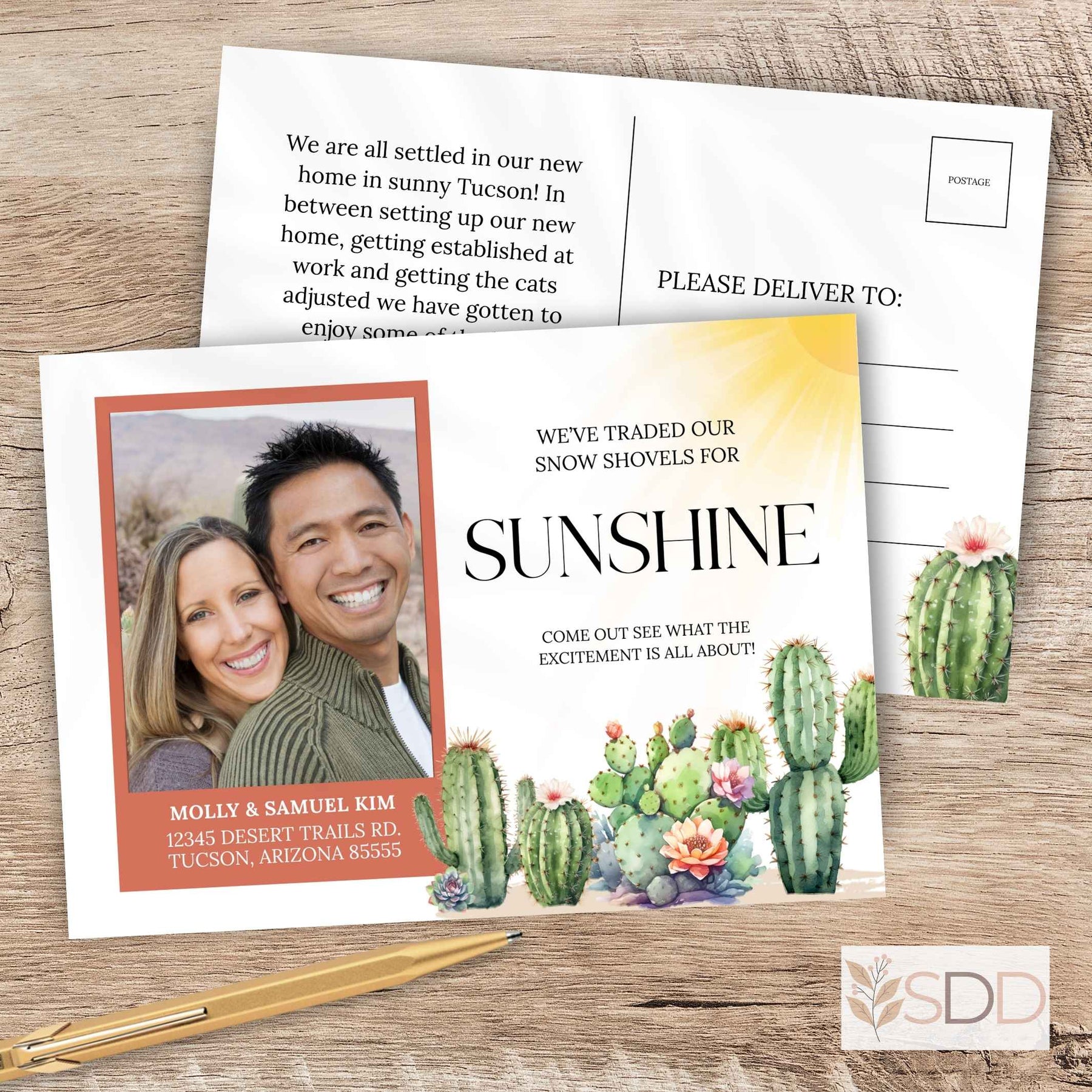 Express your personal style with Sunny Cactus Change of Address Cards! Our editable template allows you to add a photo and features vibrant desert cactus graphics inspired by the stunning landscapes of Arizona, New Mexico, and Texas. Order now for both digital and printed versions at a low price.