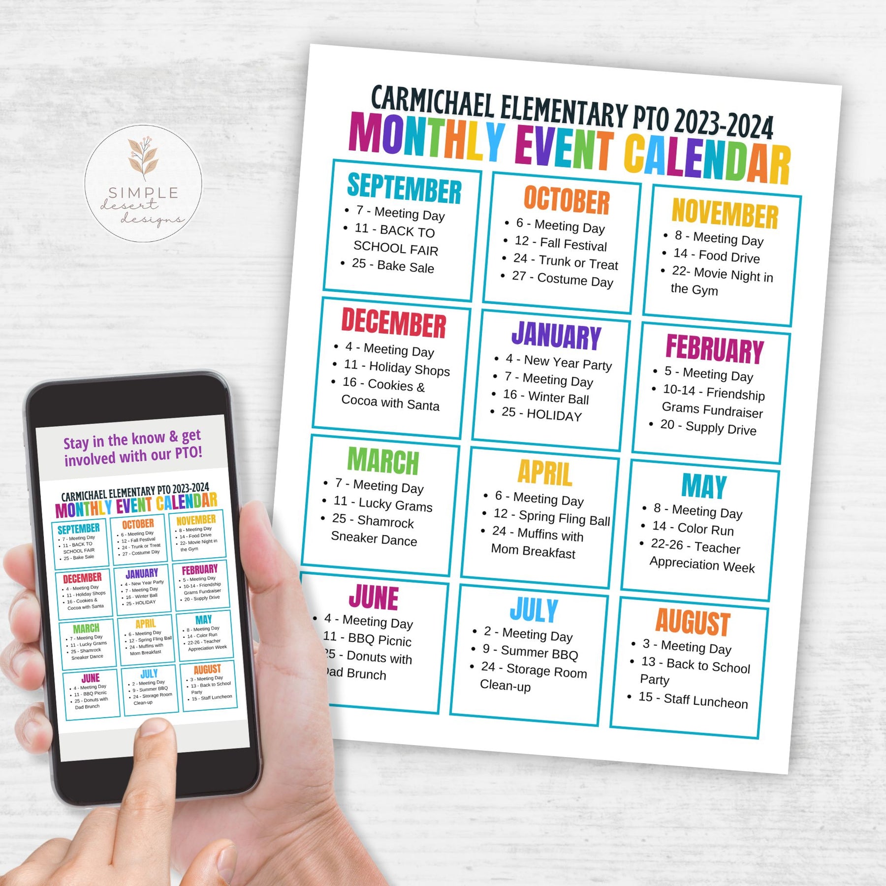 colorful color block style school pto monthly yearly annual event calendar template on phone and printed on white surface