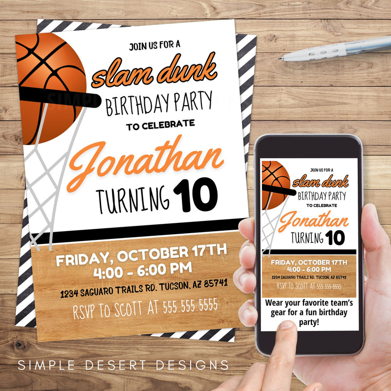 Celebrate your little one's birthday with a sporty twist! Our Basketball Birthday Party Invite makes it easy to customize your invitations in minutes, so you can send your guests digital invites or print your own in a flash. The high-quality 300 dpi images fuse style and sportiness to create a look that'll really set your basketball party apart!
