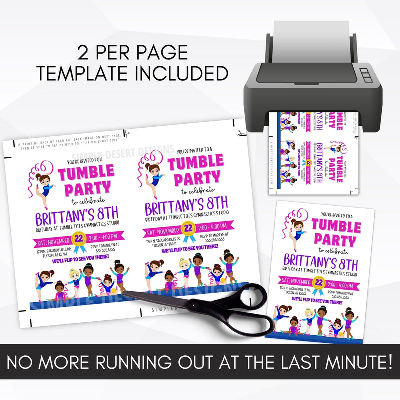 This tumbling birthday party invitation is quick and easy to edit! Throw a last minute birthday party and print the invitations at home using the 2 per page DIY invites option included. Send it as an evite or send to your favorite printer! Kids will flip for this adorable party invite!