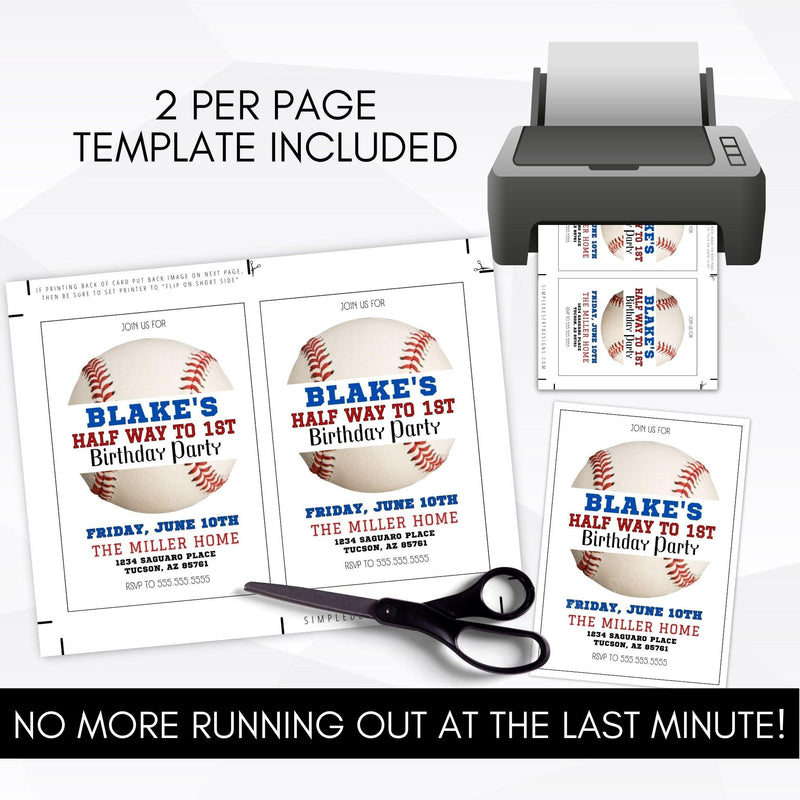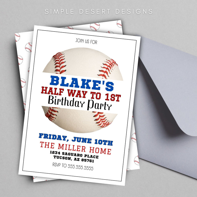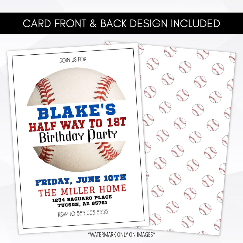Editable template features a classic baseball split in half with your little slugger's name, halftime birthday party! Unique half birthday party idea. This versatile template works for any birthday. Perfect for kids and adults alike! Just edit the text.