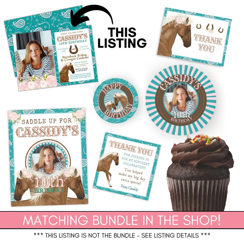 Matching bundle in the shop has everything you need for your horse lover's birthday party! Bundle includes 5x7 invitation, 2 signs, square favor tags, 2 round tags/cupcake toppers, thank you cards and a happy birthday pennant to match!