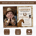 This birthday party invitation features a charming country western horse theme in beige and tan. It showcases a photo, western boot, cowboy hat, and horse, creating the perfect combination of charm and gender neutrality. With the option to add your own photo and the ability to easily send both digital and print versions for an affordable price, this invitation is a must-have!