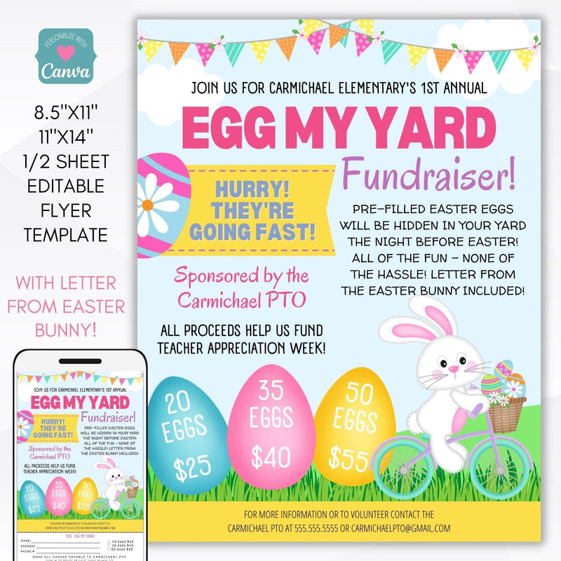 Promote your Egg My Yard Fundraiser event for your PTO, PTA, PTC, church, community center or non-profit organization with our colorful poster/sign/social media advertising set!