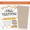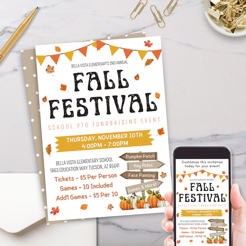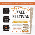 Huge savings when you purchase the matching BUNDLE in our shop! Bundle contains Fall Festival 5x7 Invitation, 8.5x11" and 11x14" flyer/poster set, half sheet take home flyer with volunteer information, square social media flyer template, tickets and print sheets to make printing multiples at home or your print shop easy!