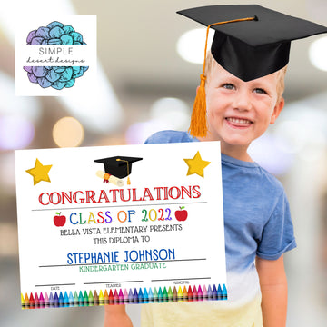 This fun and colorful editable certificate features a graduation cap, diploma, stars, apples and crayons. The school themed graphics are perfect for teacher, principal or school PTO use in the classroom or for your school graduation ceremony. It's quick and easy to customize too!