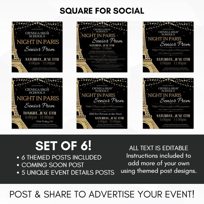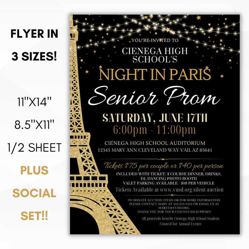 This night in Paris parisian inspired school party invitation flyer, ticket party bundle template features black and gold themed graphics to advertise your school, business, neighborhood or community HOA fundraiser event! 300 dpi graphics print crisp and clean!