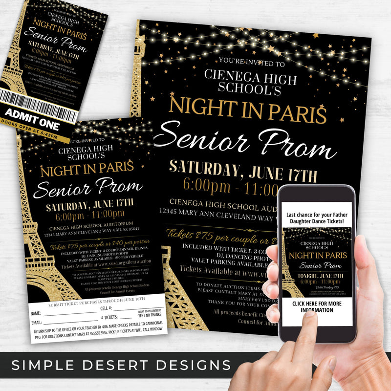Make a lasting impression with our Night in Paris Dance Flyers Ticket Bundle! This bundle includes everything you need to create a stylish and unforgettable Parisian dance theme for your next prom or charity fundraiser.