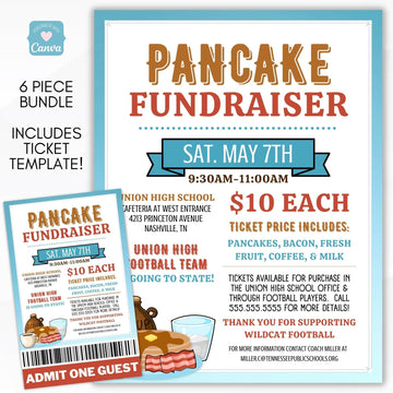 Promote your breakfast fundraiser with this bundle that includes full sheet and half sheet flyers, ticket template and an 11x14 poster! All text is editable - change/edit/delete text to create exactly what you need for your event! Promote your event on social and your website and print professional flyers cutomized by you!