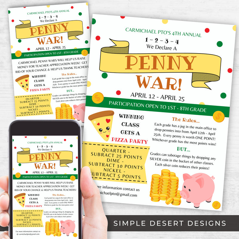 Fun graphics include pizza party for the winner, penny wars fundraiser rules and eye-catching graphics!