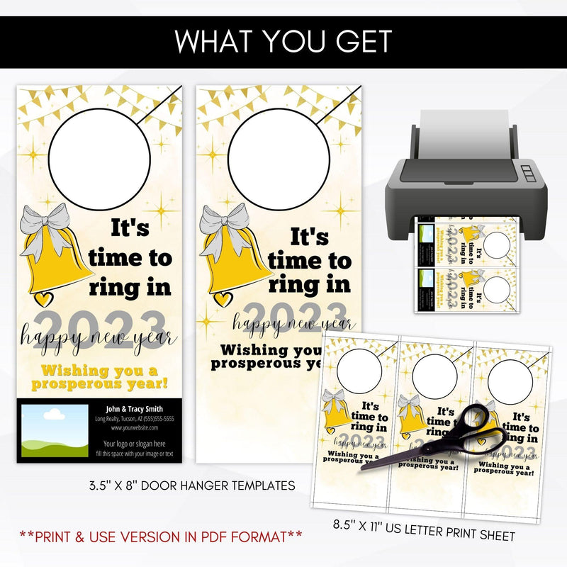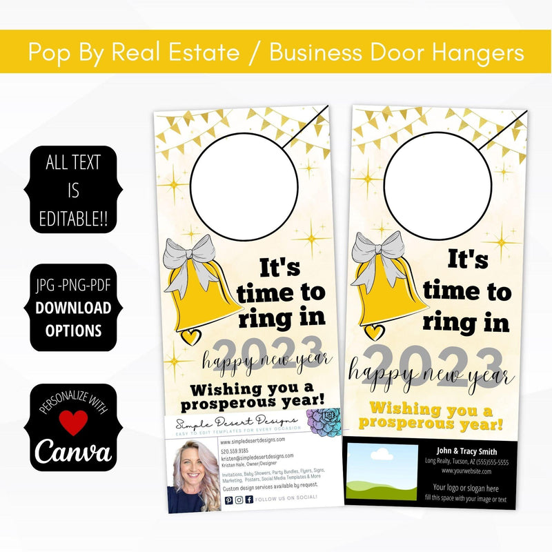 Set of 2 easy to edit printable pop by door hangers for the new year. Perfect for January pop bys or realtor referral gift ideas!