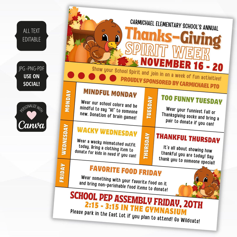 Celebrate fall and the spirit of thanksgiving with this beautiful Spirit Week Flyer Thanksgiving! This customizable editable template lets you plan the perfect school spirit week itinerary to excite students and enhance their learning. Perfect for school PTO, PTA, and elementary kids, make this year's spirit week one to remember!