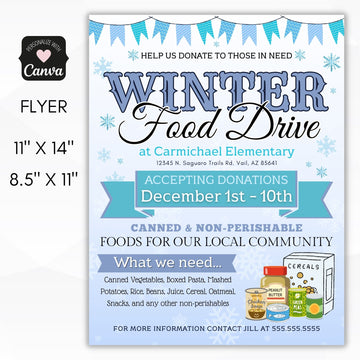 Bring attention to your winter food drive with this customizable flyer and poster set! Edit the text to meet your unique event's needs, and make sure no one in your school PTO, church or community misses the opportunity to participate in this charity fundraiser. Inspire action and foster community spirit!