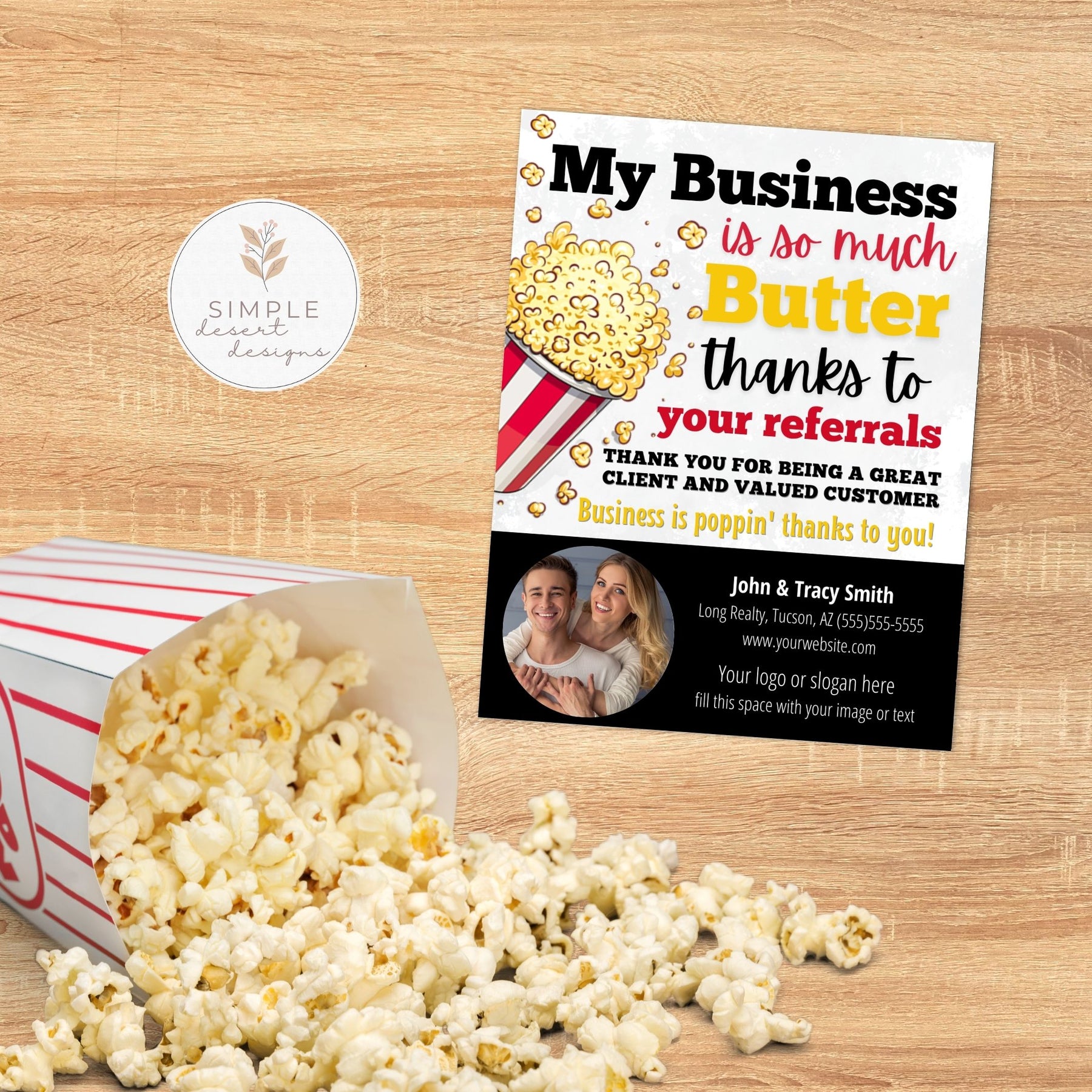 Features a playful popcorn motif with bold red and yellow color scheme, eye-catching type, and room for optional photo or branding. Designed to be cheerful and approachable, it fits real estate, client gifting, and general referral marketing themes.