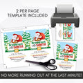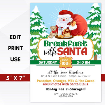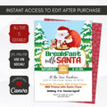 This editable template is the perfect way to invite everyone to celebrate Christmas with Santa for a pancake, donut breakfast, brunch or photos with Santa Claus school party invitation for a fun kids Christmas party.